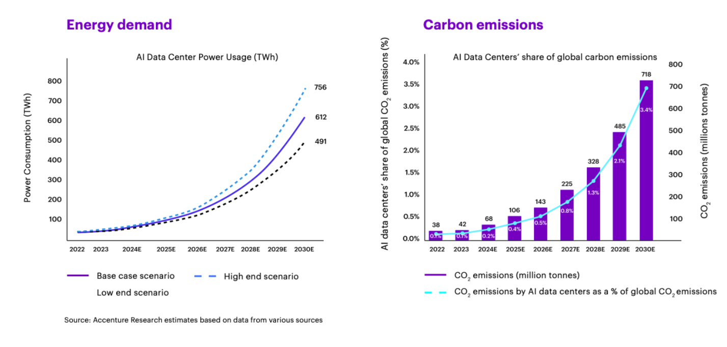 The environmental impact of artificial intelligence is rapidly becoming one of the most pressing challenges of our time. By 2030, according to our estimates at Accenture, AI’s energy consumption will grow over 10x, reaching 612 tera-watt hours (TWh) annually—the equivalent of Canada’s total electricity consumption. This significant strain on global power grids will see AI’s carbon emissions surge 11-fold to 718 million metric tons by 2030, accounting for 3.4 per cent of global emissions (up from 0.2 per cent today). Simultaneously, AI hubs are projected to consume over 3 billion cubic metres of water every year that is not returned to original sources due to evaporation and other losses. That’s more than the total annual freshwater withdrawals of countries like Norway or Sweden.