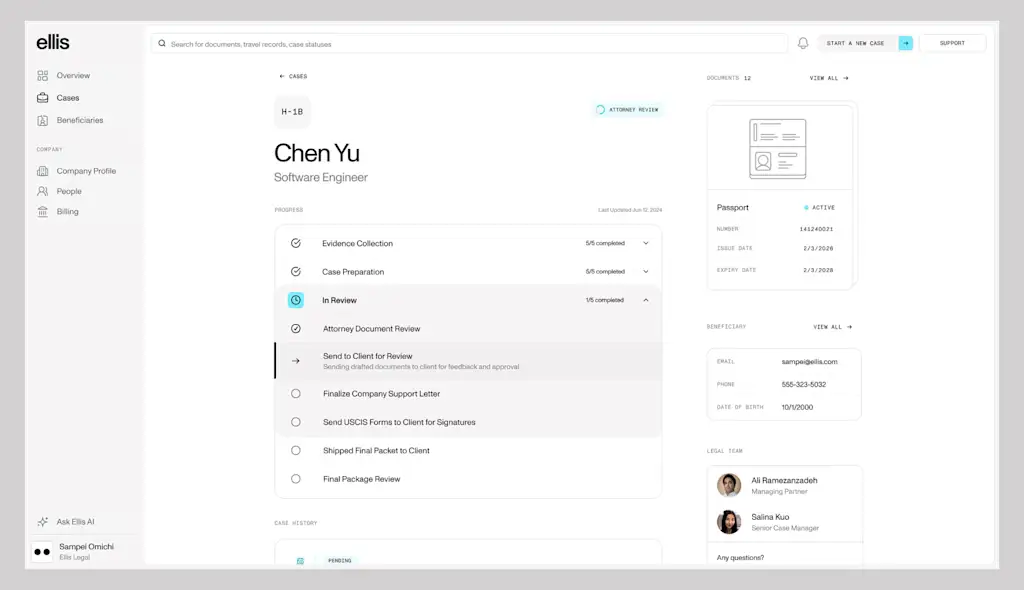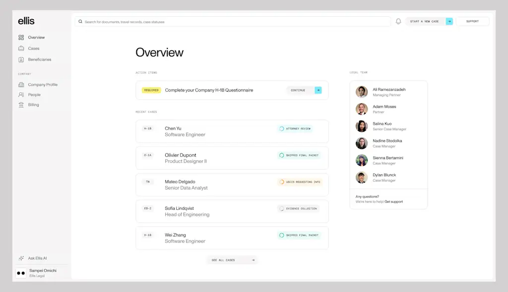 There are other immigration law firms like Manifest Law that also have a flat fee option, which is more cost-effective for employers, as well as tech platforms like Boundless that provide on-demand legal support for visa applications. Some products are fully automating the visa application process, which means there is limited input from actual immigration attorneys. Ellis is pitching its platform as a more comprehensive solution for companies—and especially tech employers—that are looking for tech-forward legal support and the full services of an immigration law firm.